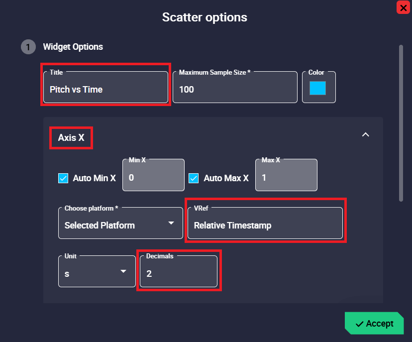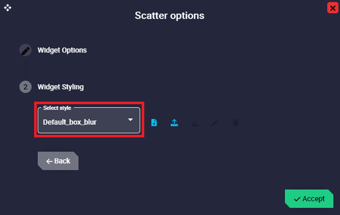 Scatter configuration - Axis X/Y The appearance of the variables in the scatter can then be modified: