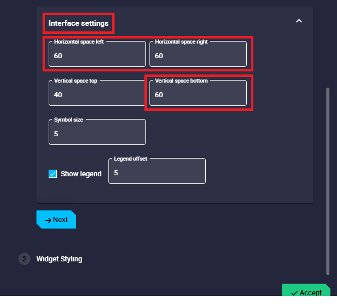 Scatter configuration - Interface settings - Horizontal space left/right: The left/right horizontal spacing of the scatter background can be customized. By default they are set to 40.