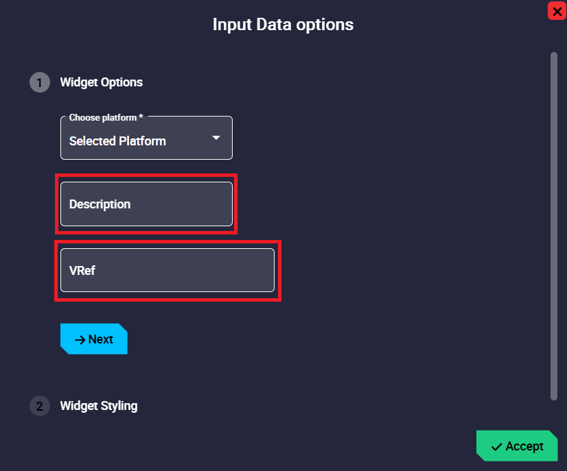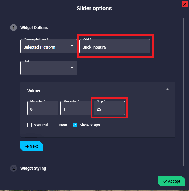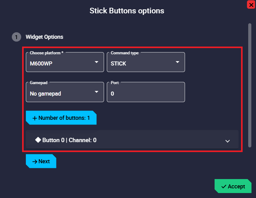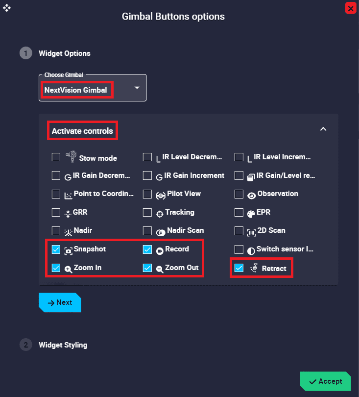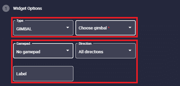 Choose platform/gimbal: Depending on the type selected, the user will have to choose the platform or the gimbal for which the widget is configured.