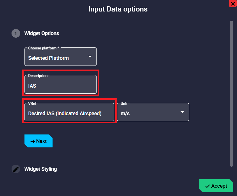 Input Data widgets allow the user to choose a certain variable and change its value by manually entering the value and sending it to the platform from the workspace during a flight.