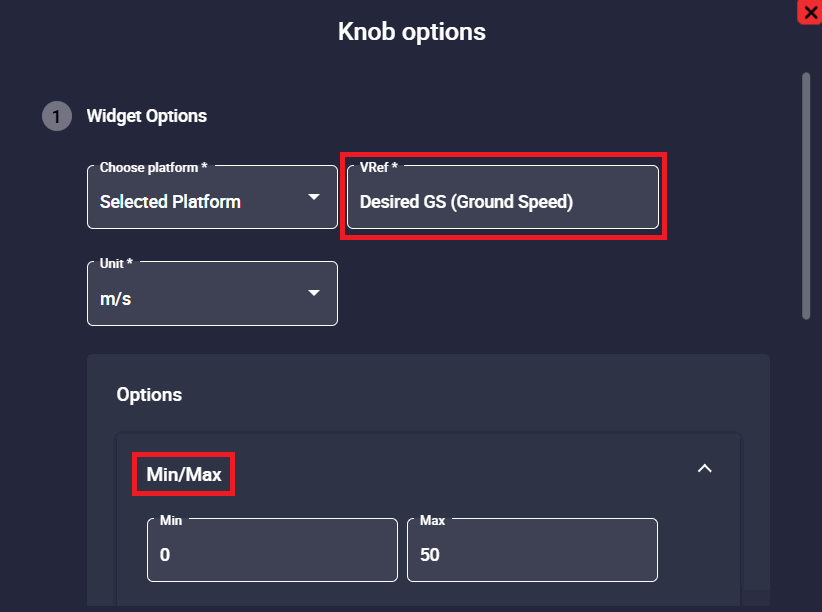 Knob widget is similar to the slider widget but in circular format. It also allows the user to choose a certain variable and change its value by simply moving the circular bar to the desired value from the workspace during a flight.