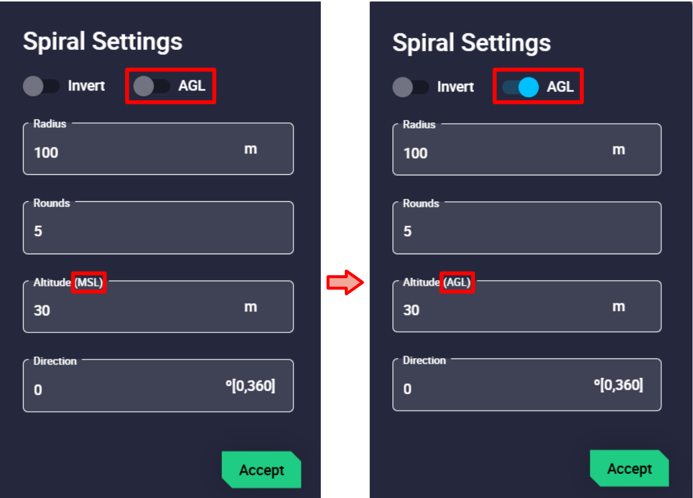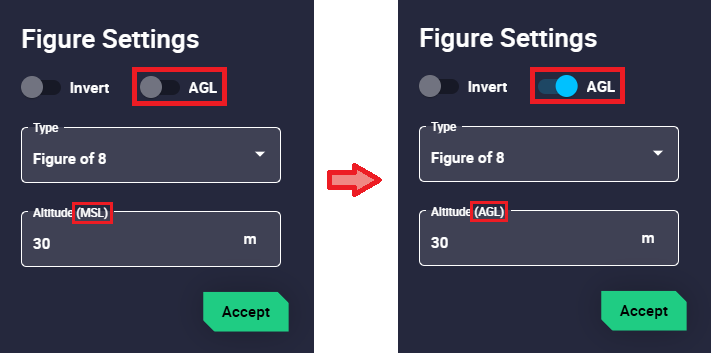 Users must enter the desired altitude value, select the altitude type (WGS84, MSL or AGL) and finally click 'Set'.