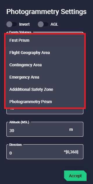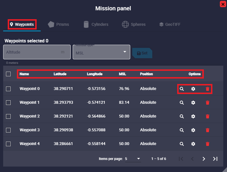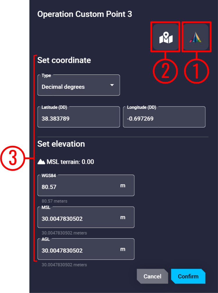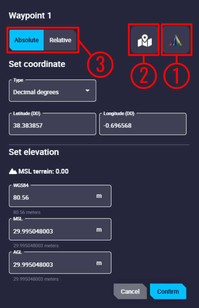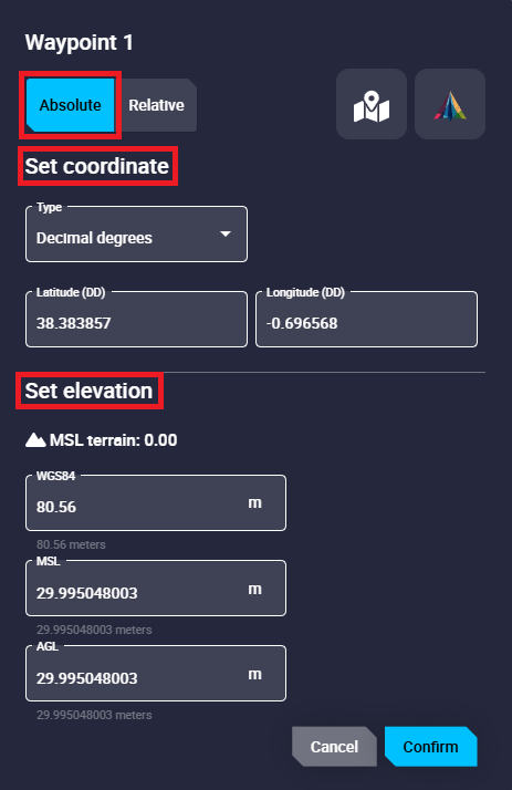 • Set elevation: Whichever way the user defines the altitude (WGS84, MSL and AGL), Veronte Ops will calculate the other 2 ways.
