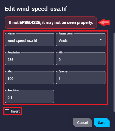 • Raster color: Color palette used to represent pixel values. Users can choose between None, Rainbow, Viridis or Grayscale.