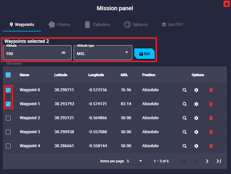It is also possible to modify the altitude of one, several or all the selected waypoints by using the Altitude edit function on the top of the list.