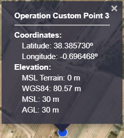 • Clicking once on the operation custom point will display a summary of the operation custom point information: Operation Custom Point ID, coordinates and elevation: