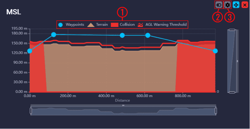 Here users can see an estimate of the height of the terrain and the height of the route to be taken as well as the collisions that could occur.