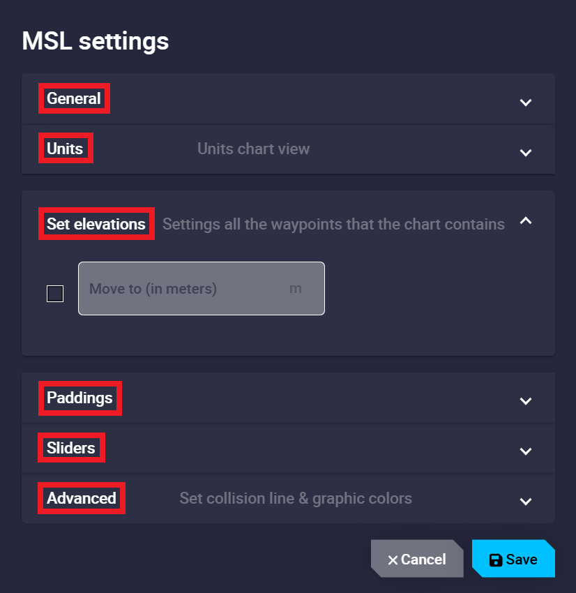 Elevation (MSL) menu - Advanced settings