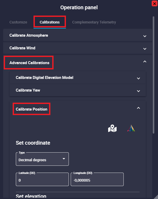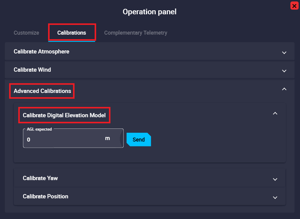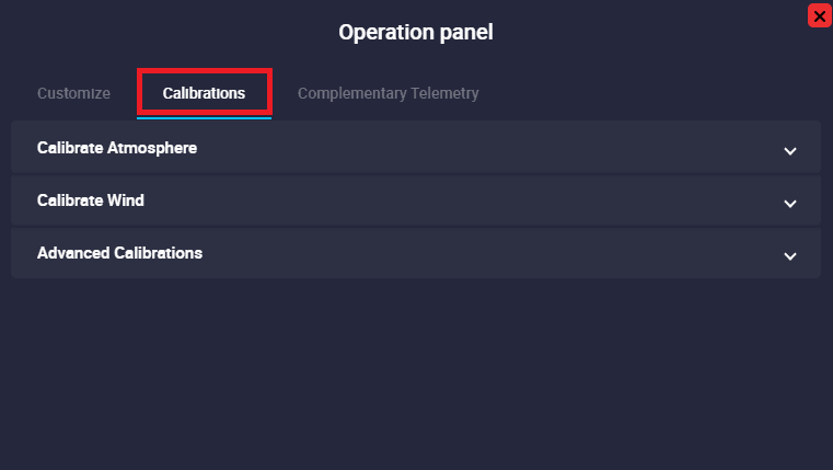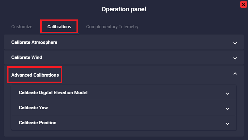 Operation Panel: Here the user can customize operation elements related to the operation, carry out some simple calibrations such as calibration of atmosphere, wind, DEM, etc., and manage complementary telemetry.