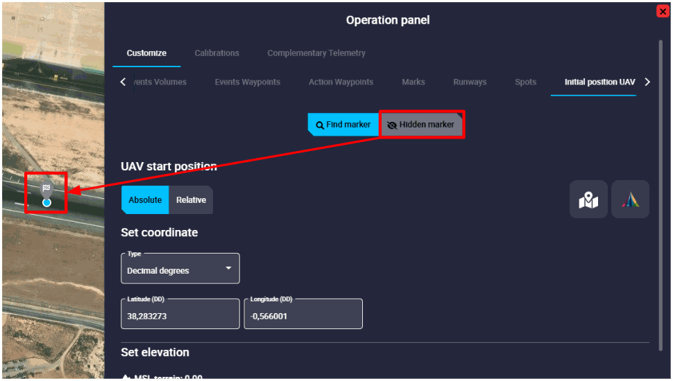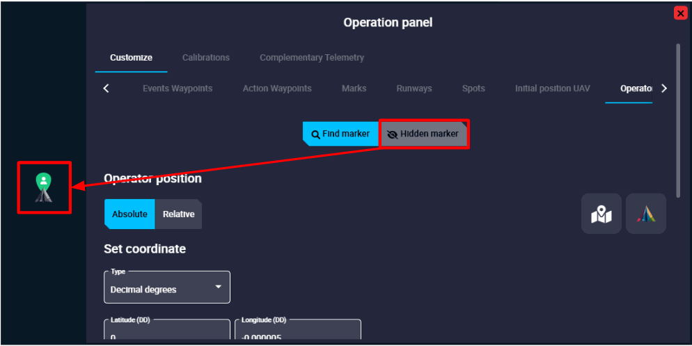 Create Mark in map and select: If the mark is not yet created in the mission, by clicking on this option, Veronte Ops will create it at the point on the map where the user clicks. In addition, Veronte Ops will automatically link this operation element to this newly created Marker.