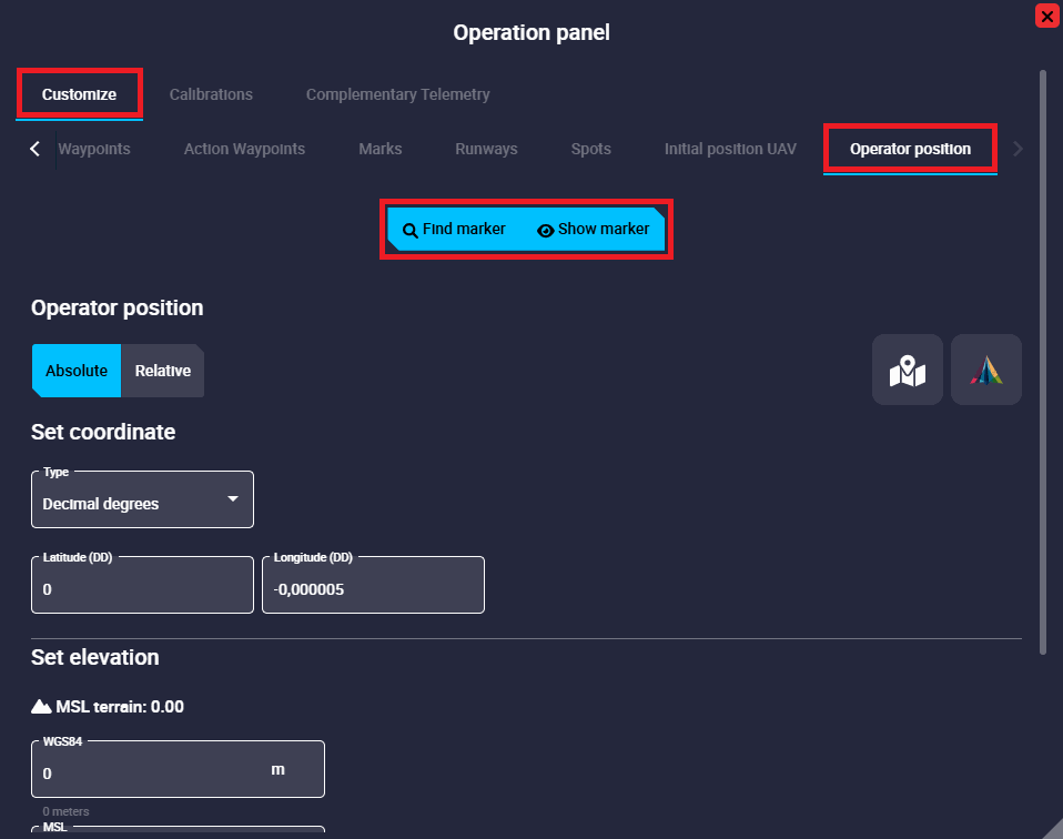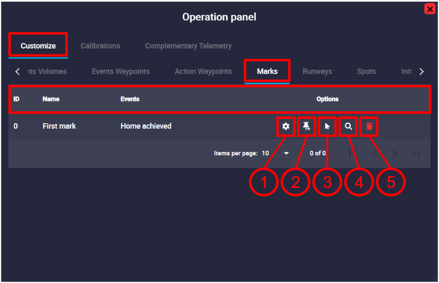 - Search: By clicking here, Veronte Ops will center and zoom in on the area of the map where this Mark is defined.