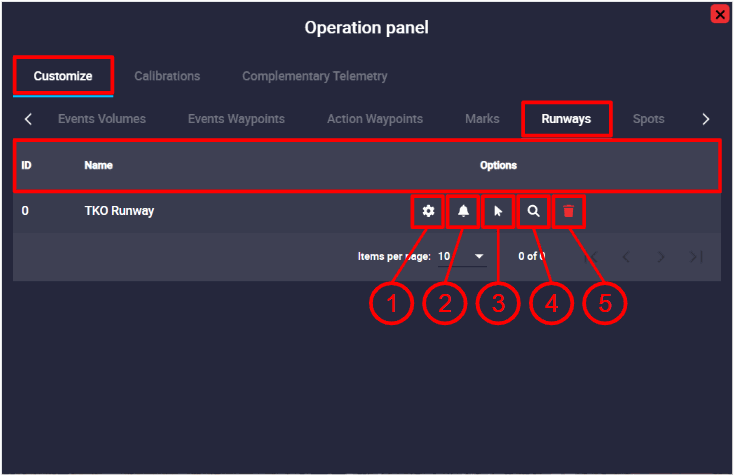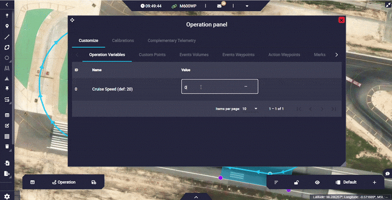 In this part of the menu users can find all the operation elements used during the operation and mission: Operation Variables, Custom Points, Events Volumes, Events Waypoint, Action Waypoints, Marks, Runways, Spots, Initial position UAV and Operator position.