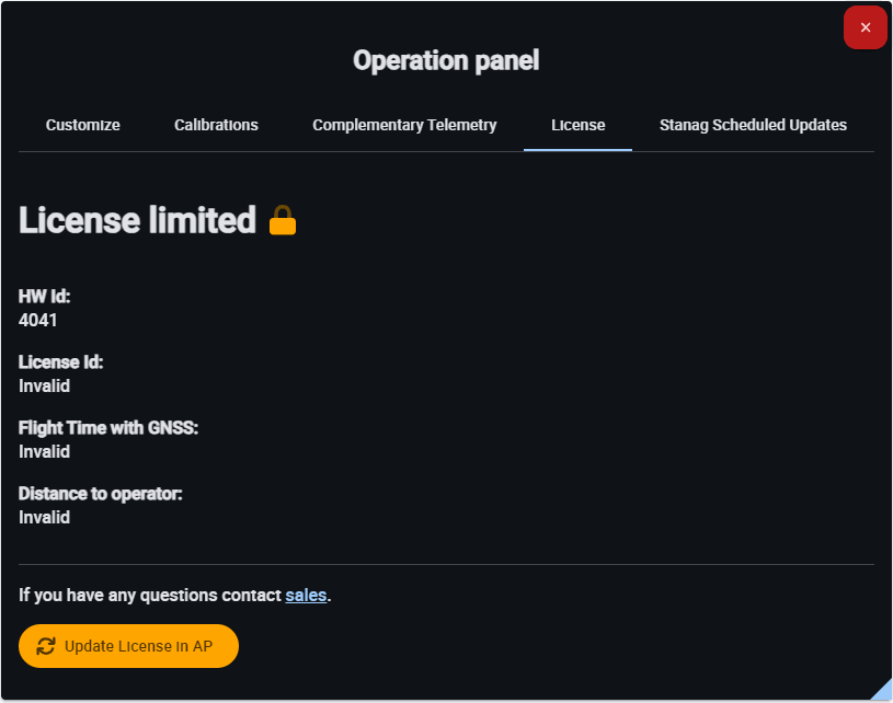 From the operator position defined in this panel, the distance allowed by the license to operate is calculated. Remember that Veronte Autopilot 1x has limited-operation depending on the license status. For more information on this limitation, please refer to the 1x Hardware Manual.