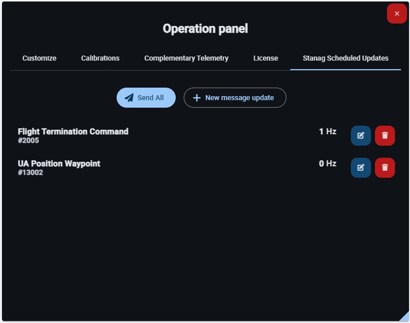 This menu is divided into 5 different functionalities: manage operation elements in the Customize tab, simple calibrations in the Calibrations tab, manage complementary parameters in the Complementary Telemetry tab, manage software licensing in the License tab, and handle interoperability updates in the Stanag Scheduled Updates tab.