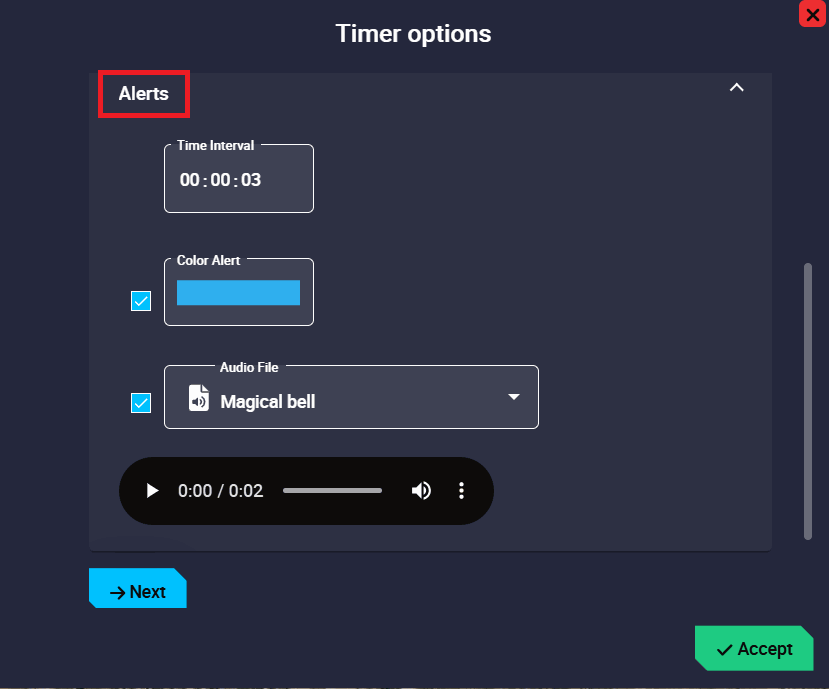 - Color Alert: If enabled, the timer will have a light alert with the color specified here when the time interval elapses.