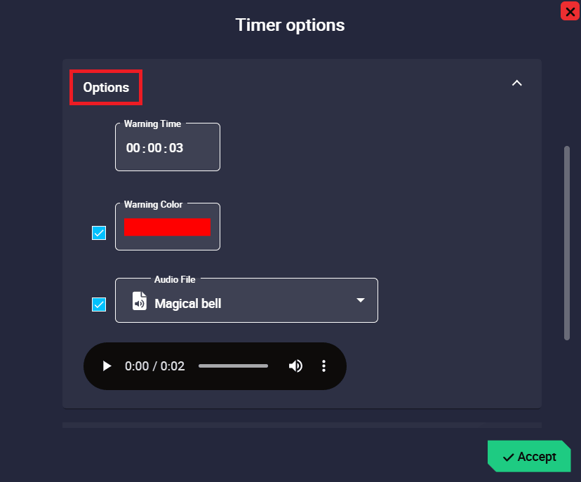 Audio File: If enabled, the audio that users have selected from the audio list will play when the warning time is reached, sounding continuously until the end of the counter/countdown.
