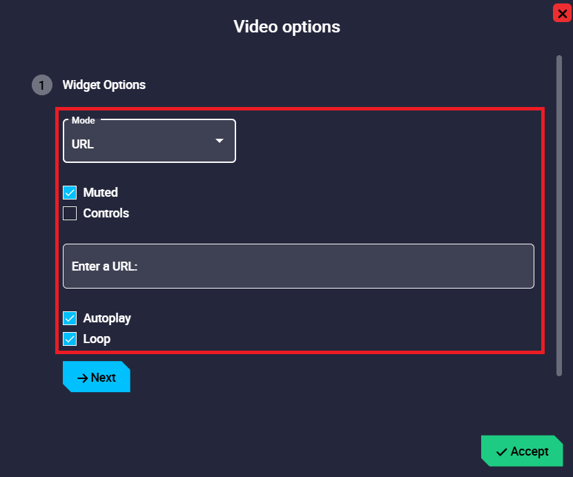 Video configuration - Mode: Choos between URL, SCREEN, WEBCAM.