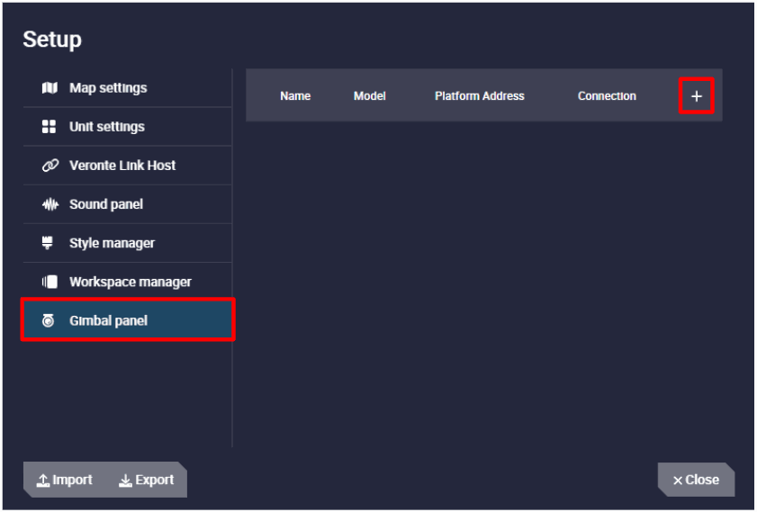 Connections: The type of connection through which Veronte Ops sends commands to the gimbal must be selected: