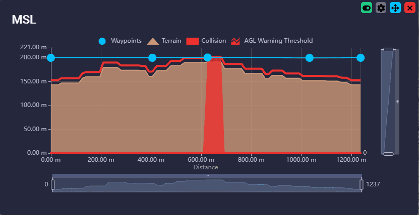 Warning Threshold: It is possible to add a warning threshold to avoid collision with terrain. This will appear as a line when users open the 'elevations' option in the created route.