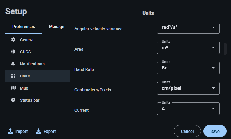 Units settings panel The following table shows all the units available in Veronte Ops: