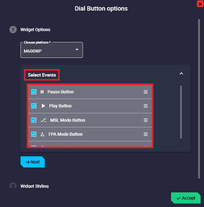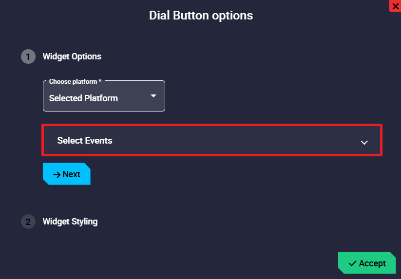 Dial Button configuration - Widget Options Select Events: Select the desired button events that will be displayed as action buttons on the Dial Button. These events must be previously configured as automations in the 1x PDI Builder software.
