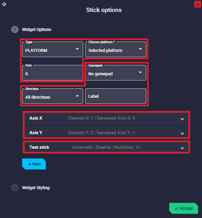 Gamepad: Users must select a desired gamepad from the list for which the widget is configured.
