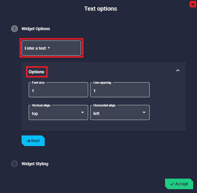 - Options: The following options allow the user to customize the Text widget as desired: