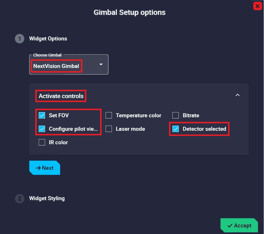 Gimbal Setup widget is a gimbal configuration panel, where the user can choose which gimbal controls can be managed from Veronte Ops.