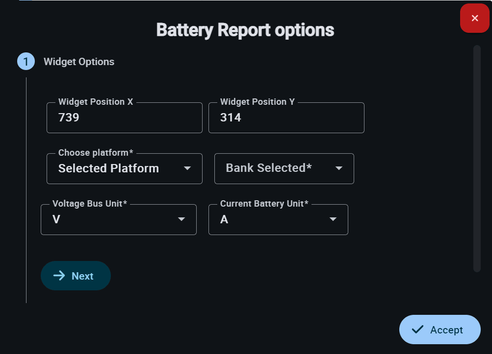 The Battery Report Options menu enables the operator to configure the monitoring of the system's power parameters on the display.