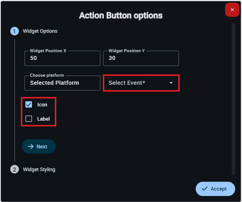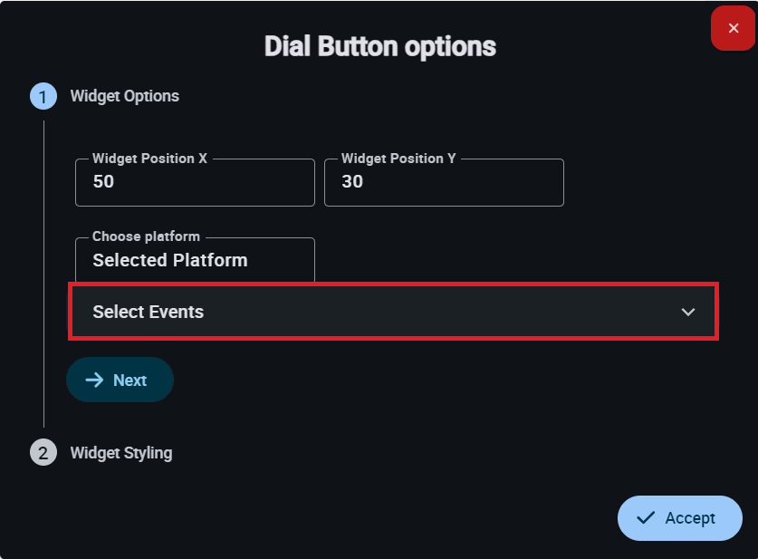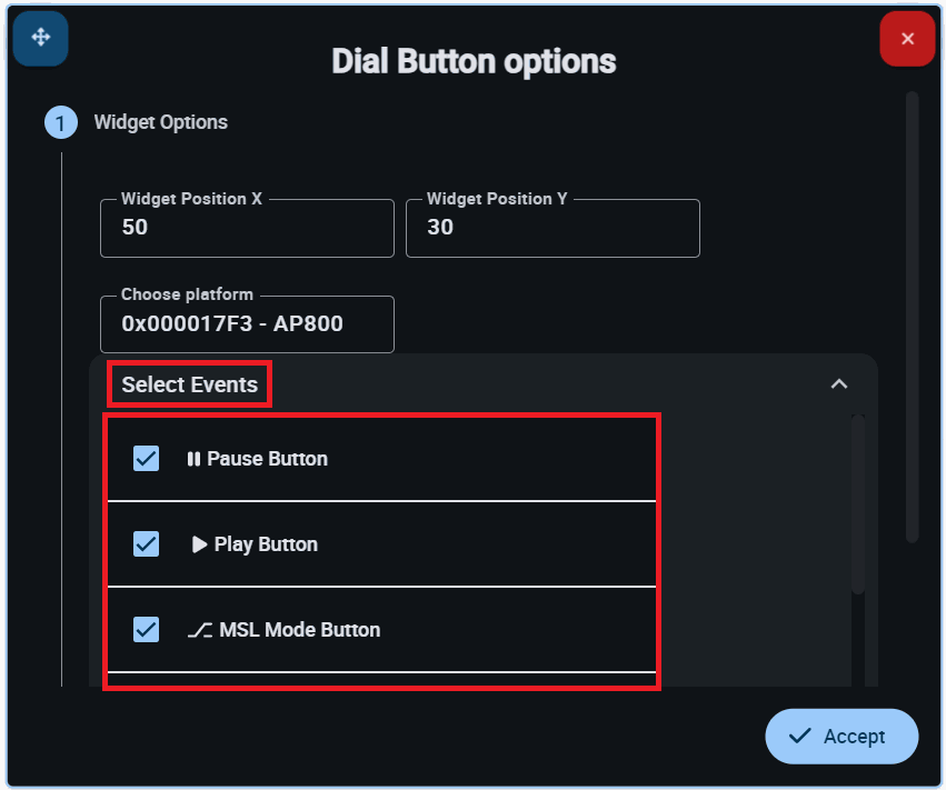 Dial Button configuration - Widget Options Select Events: Select the desired button events that will be displayed as action buttons on the Dial Button. These events must be previously configured as automations in the 1x PDI Builder software.