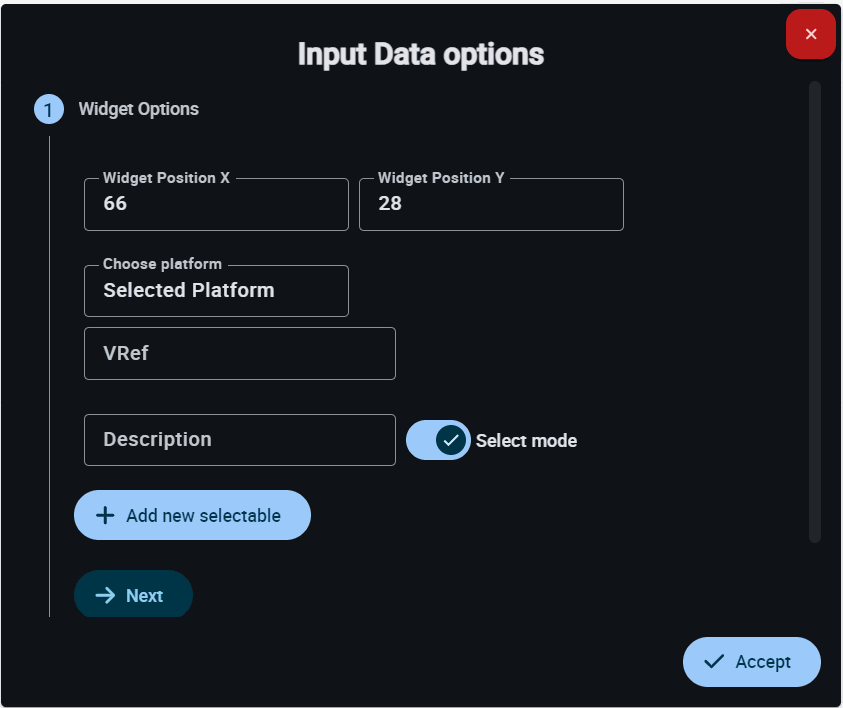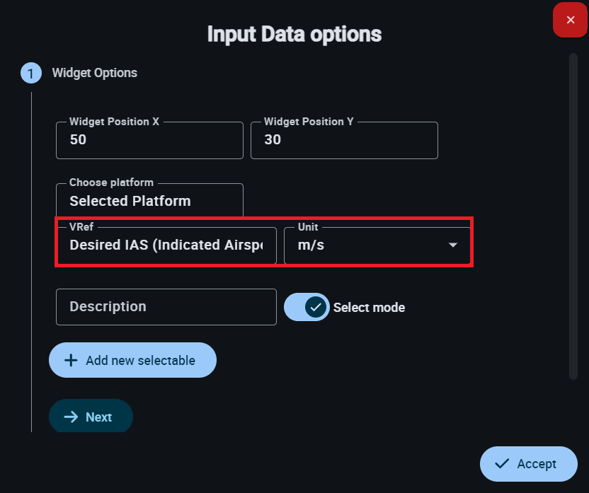 Input Data widgets allow the user to choose a certain variable and change its value by manually entering the value and sending it to the platform from the workspace during a flight.