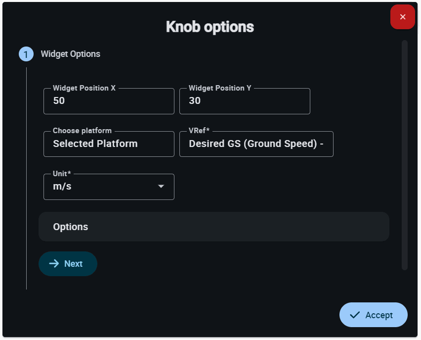 Knob widget is similar to the slider widget but in circular format. It also allows the user to choose a certain variable and change its value by simply moving the circular bar to the desired value from the workspace during a flight.