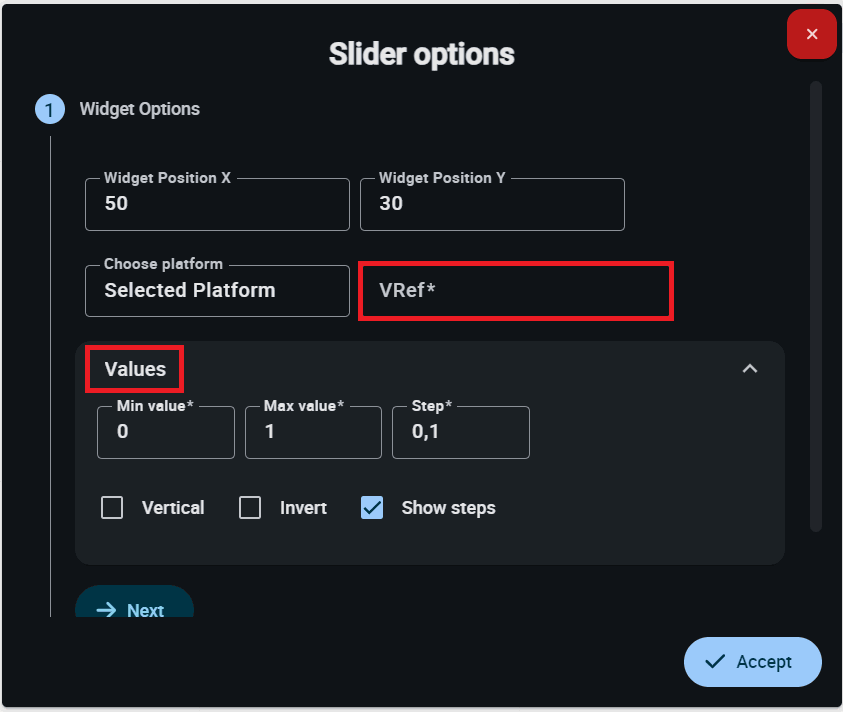 - VRef: Users can choose any real, integer or bit variable to be displayed on the slider.