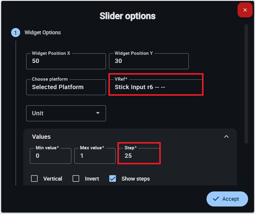 Show steps: If enabled, the step divisions of the slider are shown when interacting with the widget, otherwise they are hidden.