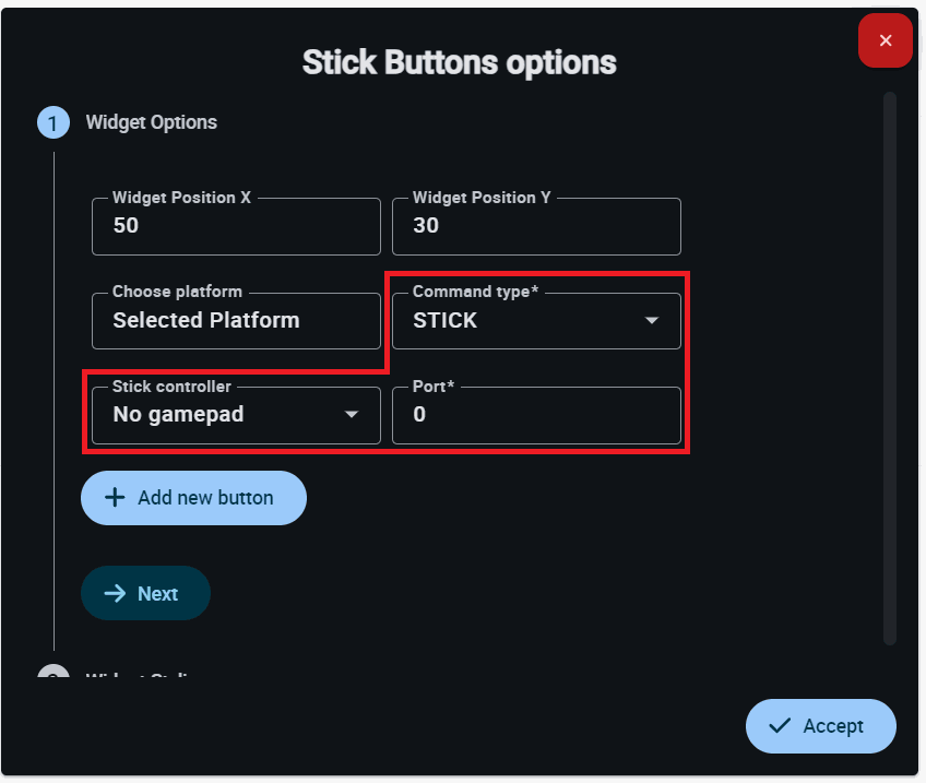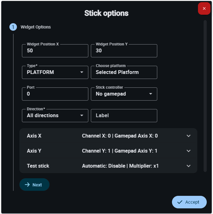 Stick controller: Users must select a desired gamepad from the list for which the widget is configured.