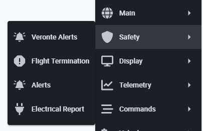 The Safety menu groups features dedicated to system health monitoring and the execution of emergency procedures according to proprietary and international standards.