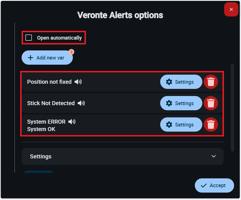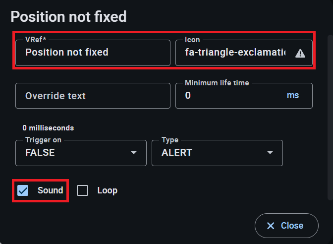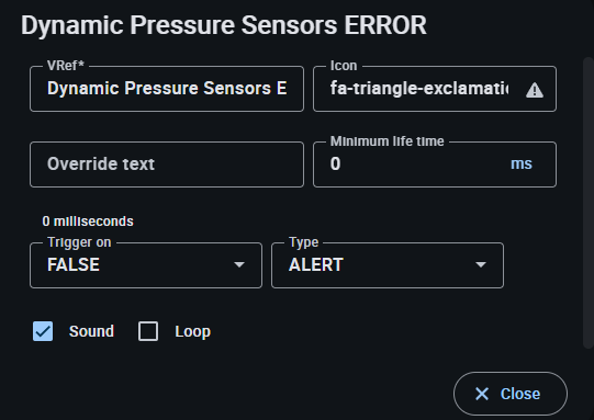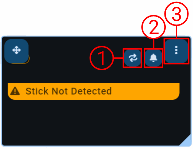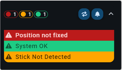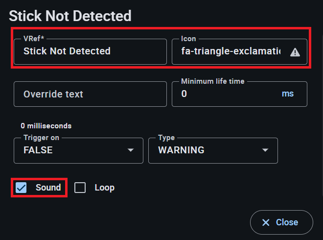 Stick Not Detected: This alert has been defined as a warning, its icon has been replace by another icon more related to the variable (a joystick icon) and has been configured without sound.
