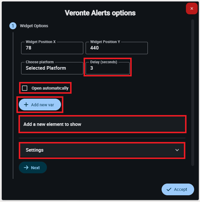 Add a new element alert to show in widget: When adding a variable (by clicking on the 'Add new var' button), the following field is added to the configuration menu: