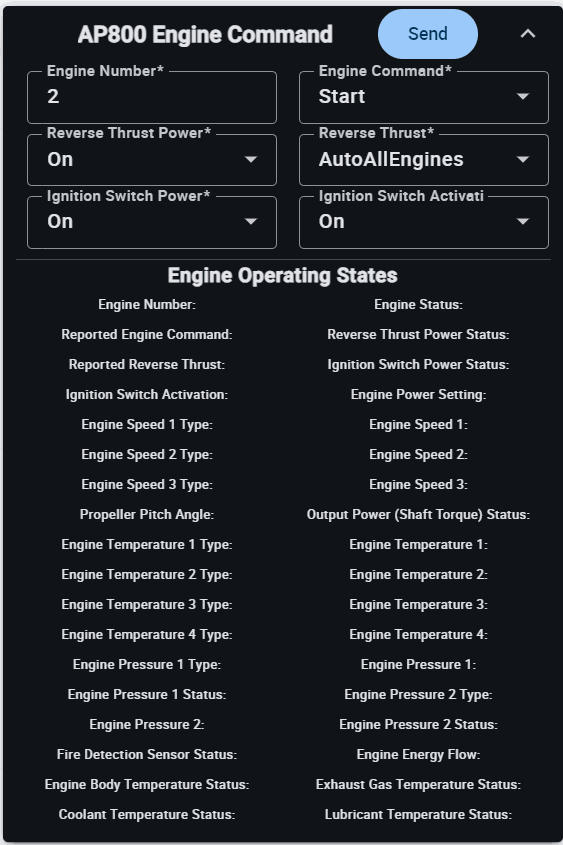 This widget is divided into two main functional areas: the Command Panel for active control and the Engine Operating States for detailed telemetry monitoring.