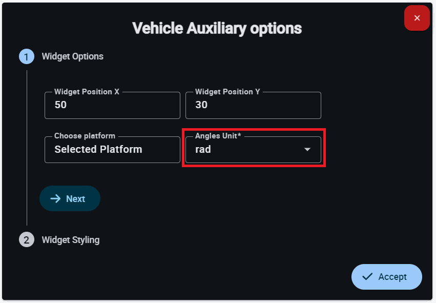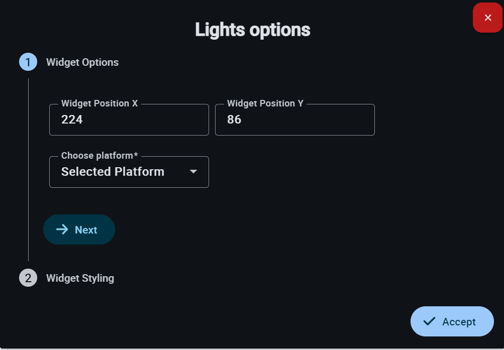 The Lights Options widgets allows the user to configure the position and data source for the lighting system widget.
