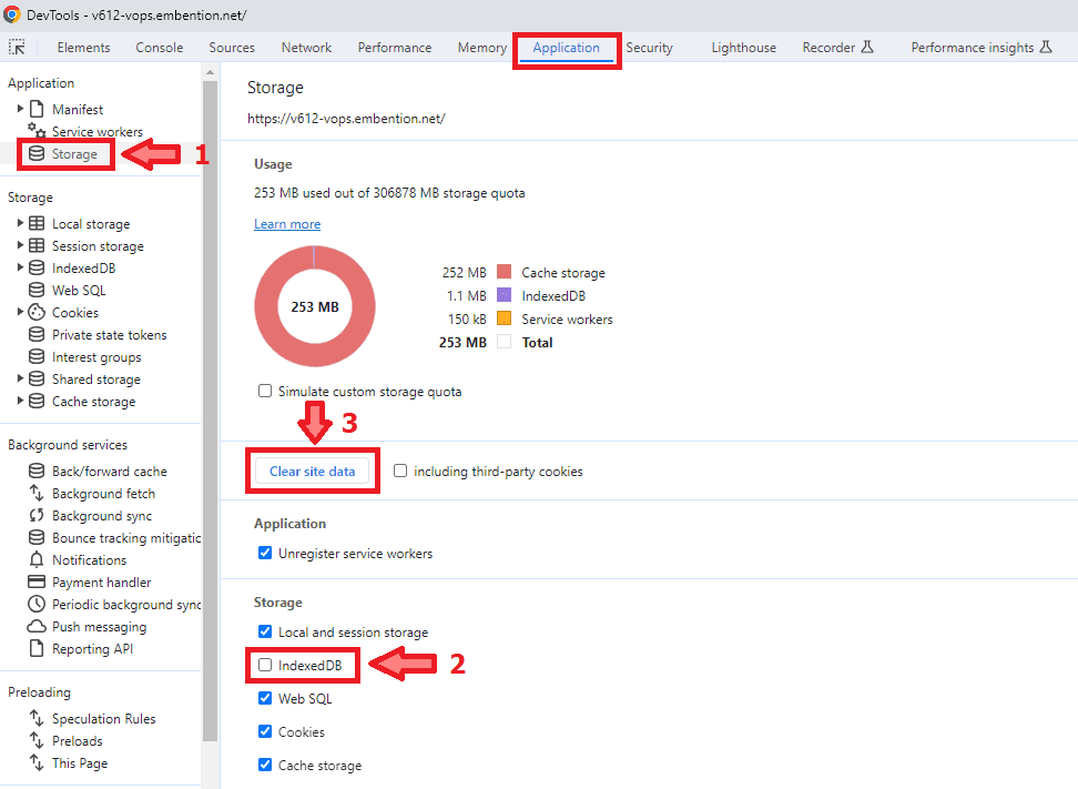 - To avoid losing workspaces and operations that are already loaded in the application, the IndexedDB checkbox must be unchecked.