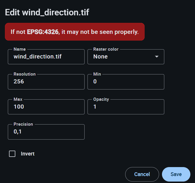 Raster color: Color palette used to represent pixel values. Users can choose between None, Rainbow, Viridis or Grayscale.