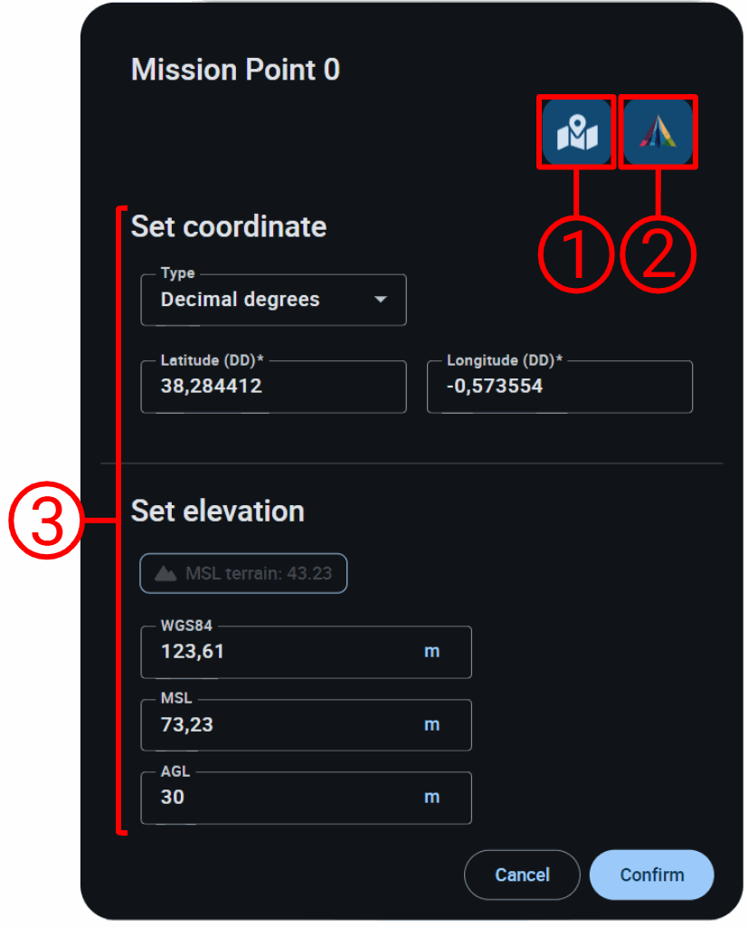 Set elevation: Whichever way the user defines the altitude (WGS84, MSL and AGL), Veronte Ops will calculate the other 2 ways.