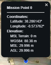Clicking once on the Mission Point will display a summary of the Mission Point information: Mission Point ID, coordinates and elevation: