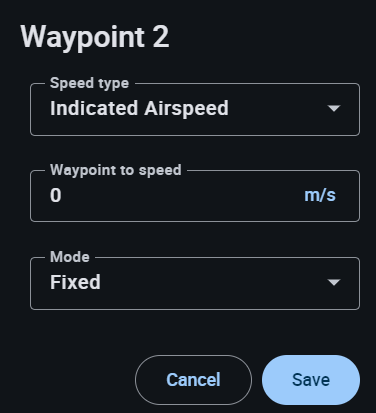 Set speed configuration: Set Speed function defines the velocity parameters that the UAV must adopt when reaching or passing a specific waypoint.
