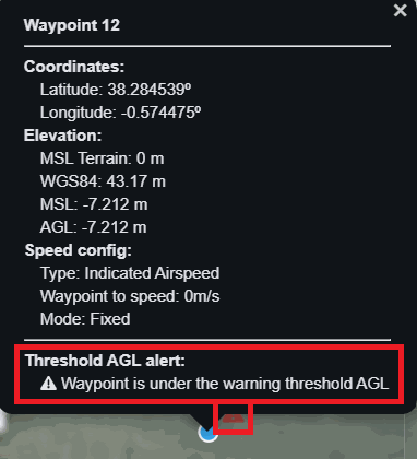 In addition, it will also be indicated in the waypoint information as "Threshold AGL alert":
