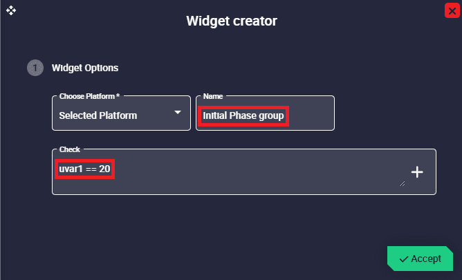 Therefore, this implies that: Only when the flight phase is the one with ID 20 (initial phase), widgets added to this group, in this case the Checklist widget, will be displayed.