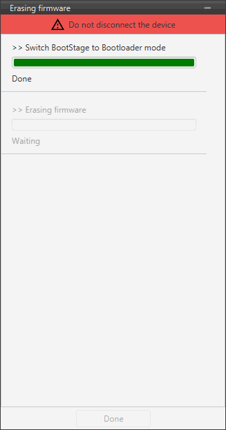 By selecting this option, it is possible to erase the firmware from the connected device. The unit will remain in bootloader mode without firmware.