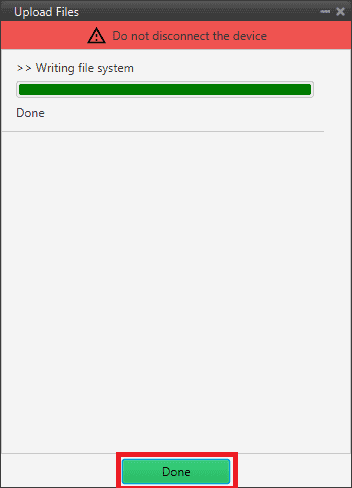 This tab will flash the device. That is, the connected device is reset and the files previously loaded into memory (in the slots) will be uploaded to the connected device.