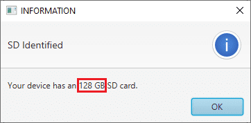 As the identification process is quite fast, a message with the information about the capacity of the SD card will quickly appear: